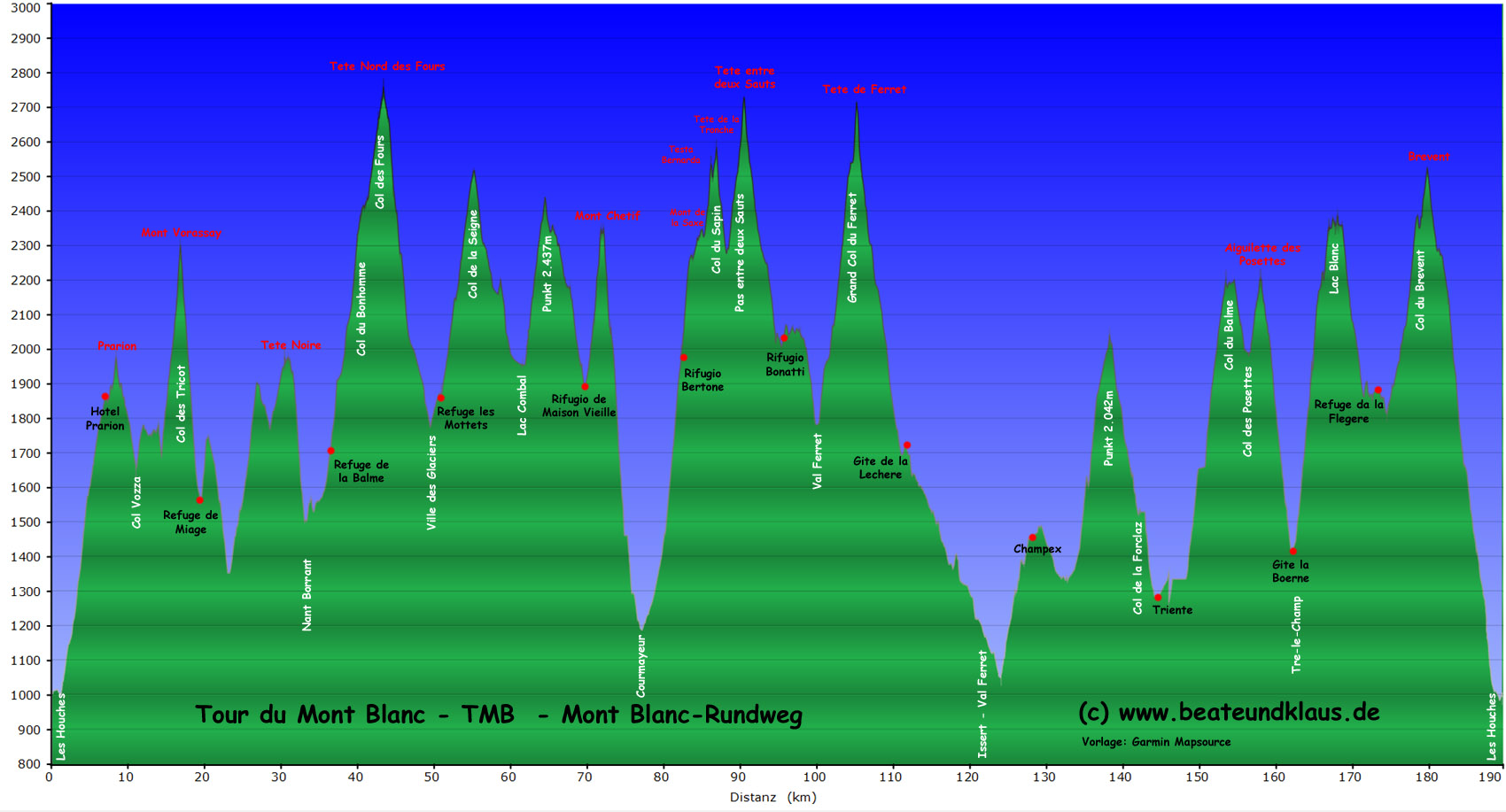 Wir haben in 13 Tagen den höchsten Berg der Alpen durch drei Länder (Frankreich - Italien - Schweiz) komplett zu Fuß umrundet. Wir laden Euch ein, uns auf interessanten und abwechslungsreichen Wegen gut 190km um den Mont Blanc herum zu folgen und die ständig wechselnden An- und Aussichten zu genießen. Wir bestiegen neben unzähligen Pässen (Pas) und Sätteln (Col) auch 12 Gipfel und brachten es so auf 12.745 Höhenmeter. Die Tour sollte während der Hauptsaison (Juli/August) gut geplant und die Hütten frühzeitig reserviert werden. Reservierung und Infos siehe hier oder hier. Durch die Wahl von (alpinen) Alternativrouten konnten wir den Massenströmen gut ausweichen und waren oftmals alleine unterwegs. Für jeden Tag gibt es in Form der üblichen Diashow GPS-Tracks, Höhenprofile und wie gewohnt viele eindrucksvolle Fotos. Klickt einfach auf Tag 1 unten - viel Spaß wünschen Beate und Klaus |