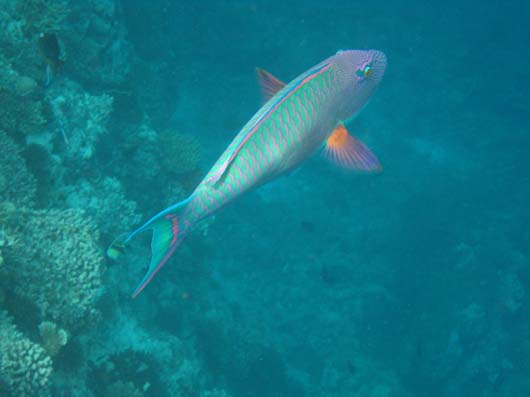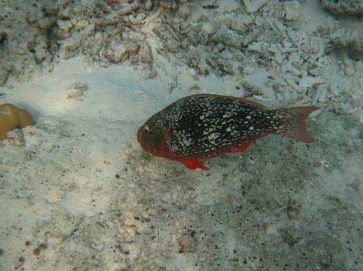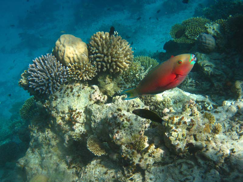Papageifische schaben mit ihren starken Zähnen Algen vom Riff und produzieren wegen des darunter liegenden