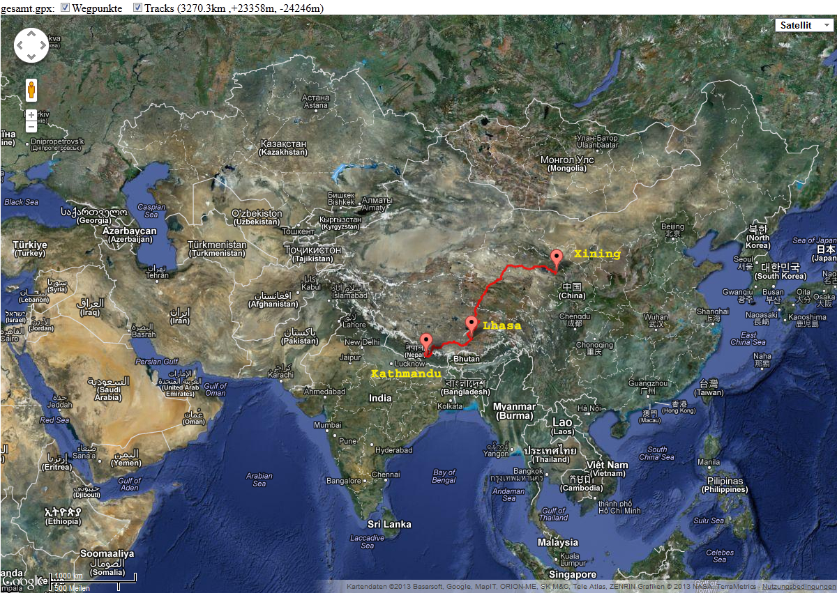 Wir sind nach Xining geflogen und mit der Tibet-Bahn 35 Stunden meist über 4.500m im Mittel durch fantastische Landschaften knapp 2.000km nach Lhasa gefahren und haben den höchsten Bahnhof der Welt passiert. Unser ursprünglicher Plan sollte uns anschließend über das westtibetische Hochland zum Heiligen Berg Kailash bringen, den wir zu Fuß umrunden wollten (Kora). Weiter war die Ausreise über das Everest-Basecamp nach Nepal-Kathmandu geplant. Fünf Tage vor Reiseantritt erfuhren wir, dass die VR China für die Autonome Republik Tibet ab 01. Oktober keine Visa mehr erteilt, so dass alle westlichen Touristen zum 30. September Tibet verlassen müssen. Aus zeitlichen Gründen haben wir dann auf direktem Weg von Lhasa den Himalaya durchquert, sind pünktlich nach Nepal ausgereist und weiter nach Kathmandu gefahren. Für die übrige Zeit organisierten wir kurzfristig ein 12tägiges Trekking im Langtang-Gosaikunda-Helambu-Gebiet. Wie immer gibt es in Form der üblichen Diashow GPS-Tracks, Höhenprofile und wie gewohnt viele eindrucksvolle Fotos. Klickt einfach auf das kleine Bild "Start Xining" unten - viel Spaß wünschen Beate und Klaus |