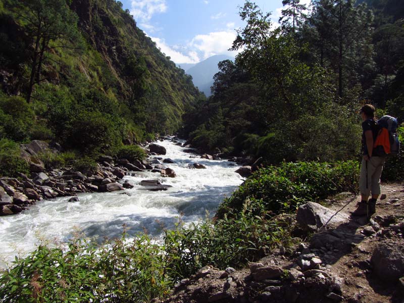 Wir wandern von Syaphrubesi 1.489m unschwierig immer dem Langtang Khola (Fluss) entlang bis nach Lama Hotel 2.460m