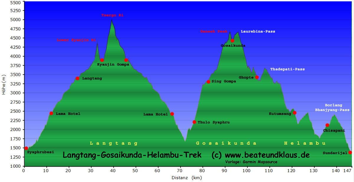Wir haben in zwölf Tagen 148,5km zurückgelegt und dabei 9.908m im Aufstieg und 9.997m im Abstieg absolviert.