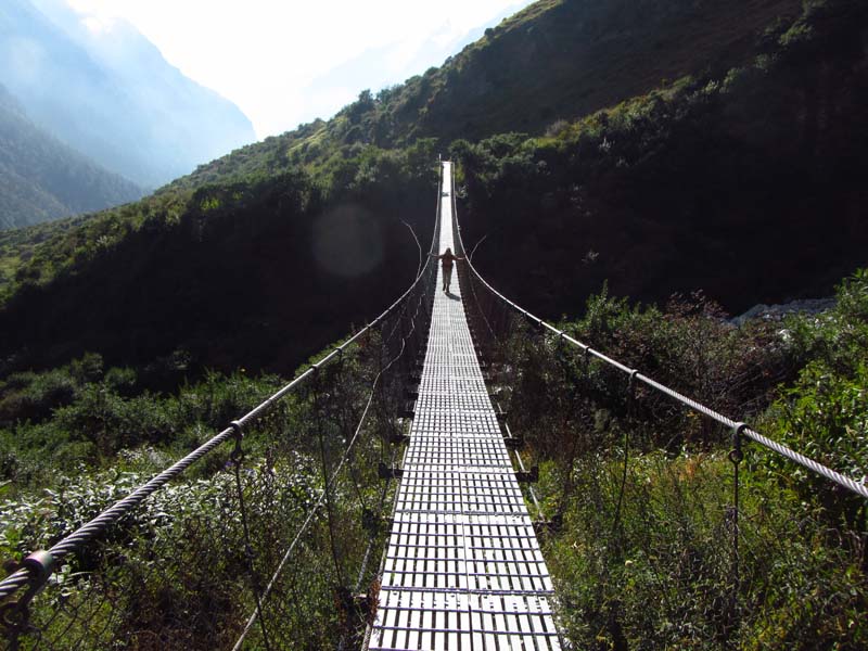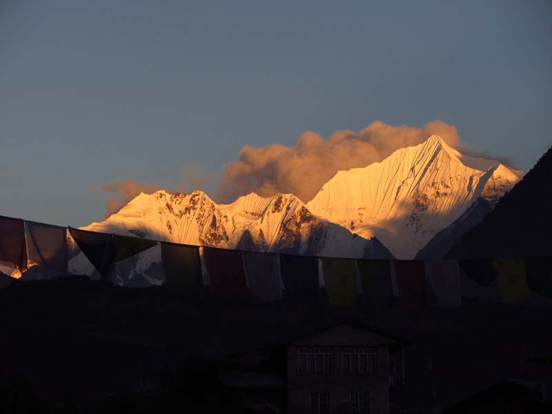 Heute wandern wir den Langtang Khola entlang stetig bergauf, sehen erstmals Langtang Lirung 7.227m und bei unserer Lodge in Langtang 3.429m einen fabelhaften Sonnenuntergang am formschönen Ganchenpo 6.387m