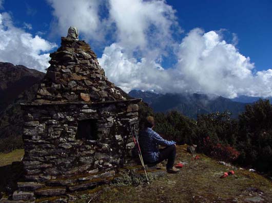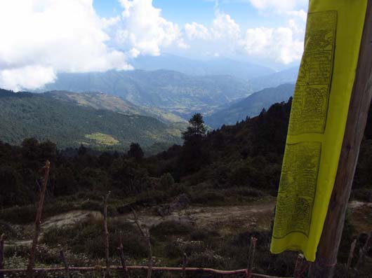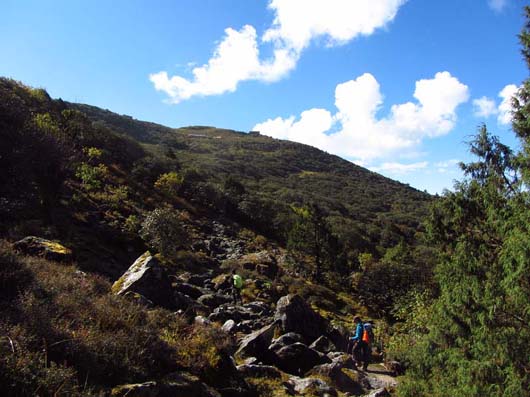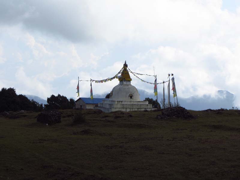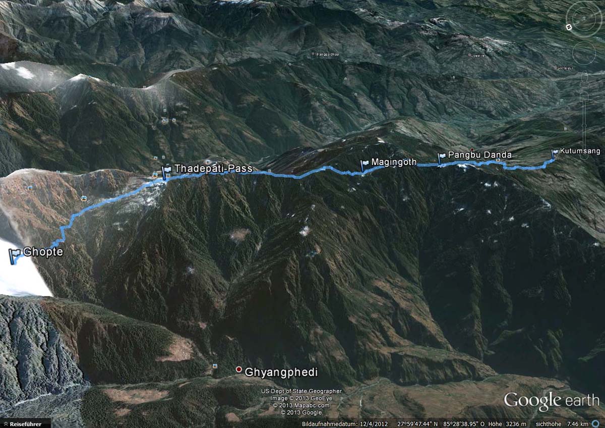 Nach so einem Panaorama von gestern geht es heute recht unspektakulär zu. Wir steigen hinauf zum Thadepatipass (3.656m), beginnen den Helambu-Trek und passieren die Ortschaften Mangengoth (3.252m) und Pangbu Danda (3.267m) bei einem langen Abstieg hinunter nach Kutumsang (2.498m)