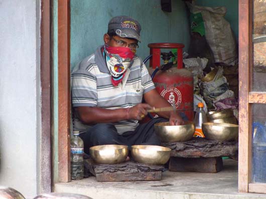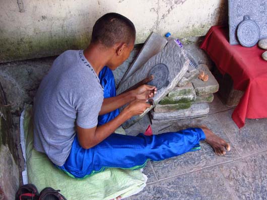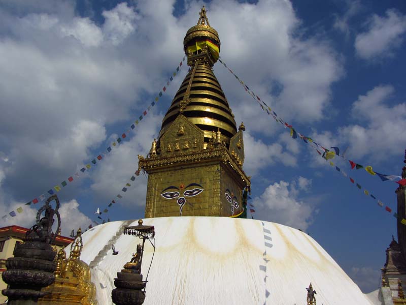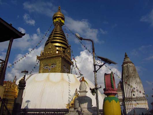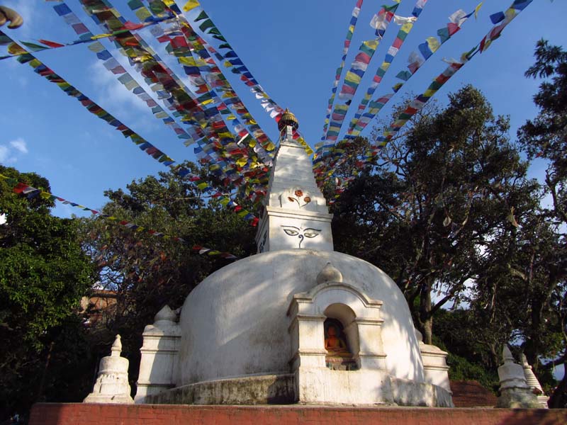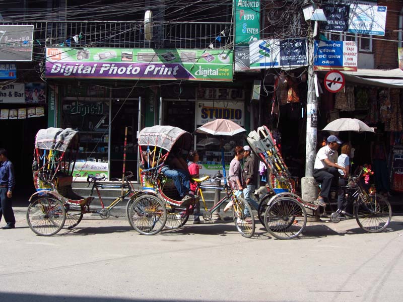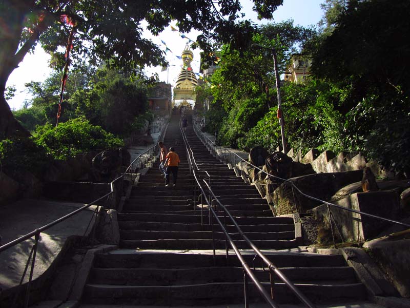 Wie so überall gibt es viel zu viele Rikschas für viel zu wenige Touristen, also rauf auf den Bock und ab nach Swayambhunath :-)