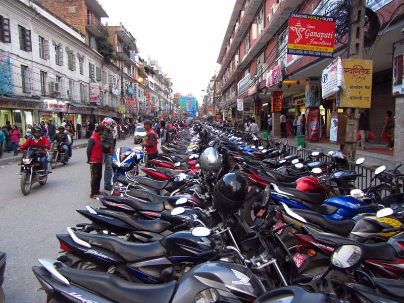 Kathmandu hat weiterhin ein starkes Verkehrsproblem. Hier parken Hunderte von Motorrädern zweirreihig!