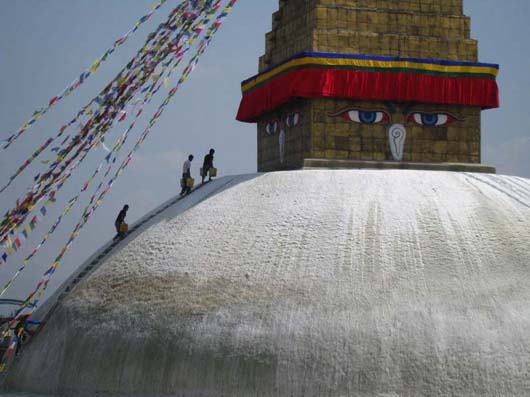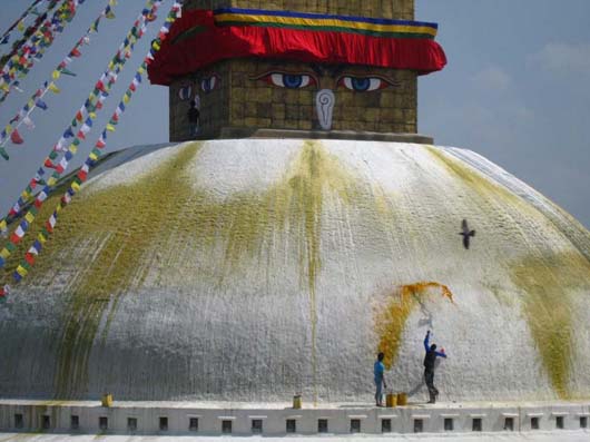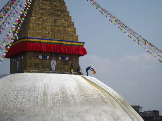 Zum Abschluss besuchen wir noch einmal die Boudhanath Stupa und dürfen zufällig einer Restaurierung beiwohnen.